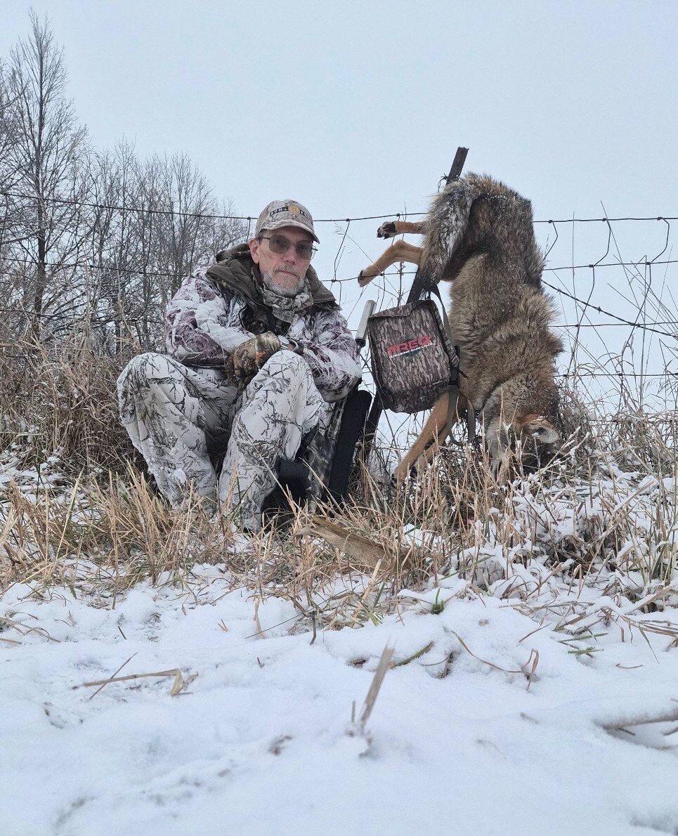 With the first of two coyotes he killed on his initial outing with the FREQ. He had been unable to attract any coyotes where he lives using electronic callers, due to excessive calling pressure.